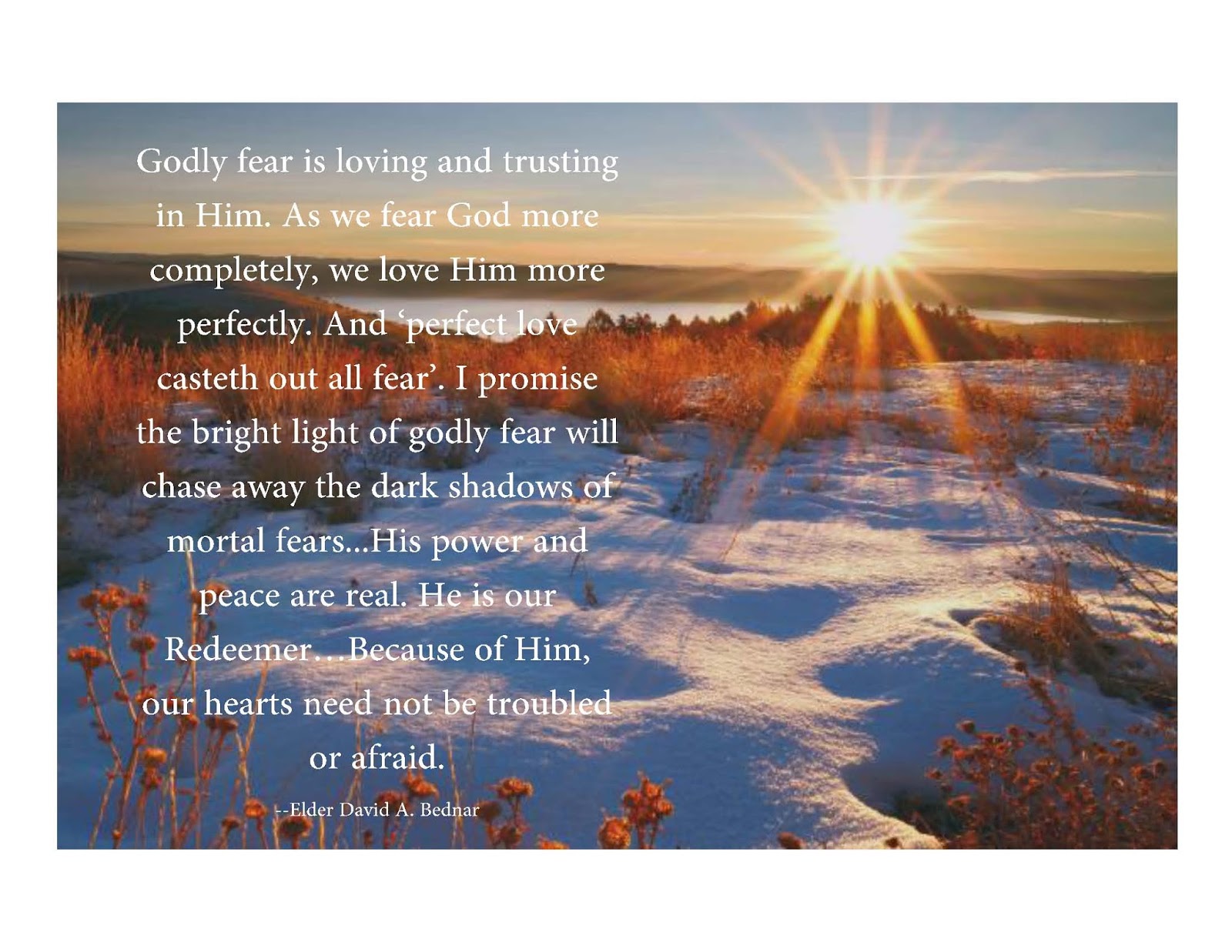 Finally, Elder Bednar addressed godly fear—which he said “is a source of peace, assurance, and confidence.” This fear “encompasses a deep feeling of reverence, respect, and awe for the Lord Jesus Christ (see Psalm 33:8; 96:4) and “godly fear dispels mortal fears”—because if we have godly fear, we know who Christ is and we know that His Atonement is more powerful than ANYTHING that can ever happen to us. Whatever Satan throws at us, whatever scary things may go on in this world, Jesus Christ is the answer—and as we fear Him, we have no need to fear anything else. Elder Bednar stated, “Godly fear is loving and trusting in Him. As we fear God more completely, we love Him more perfectly. And ‘perfect love casteth out all fear’ (Moroni 8:16). I promise the bright light of godly fear will chase away the dark shadows of mortal fears (see D&C 50:25) as we look to the Savior, build upon Him as our foundation, and press forward on His covenant path with consecrated commitment. His power and peace are real. He is our Redeemer, and I witness He lives. And because of Him, our hearts need not be troubled or afraid (see John 14:27).” I don’t know about you, but I definitely experience fear as I look at the world we live in, so appreciated Elder Bednar’s reassurance that we don’t have to be afraid and also his lessons on HOW we can actually turn to Christ and overcome those fears. When we “learn of [Christ], and listen to [His] words, walk in the meekness of [His] Spirit, [then we] shall have peace in [Christ]” (D&C 19:23).
